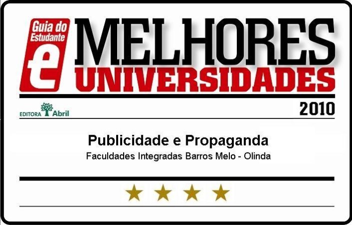 O curso de Publicidade e Propaganda das faculdades Integradas Barros Melo, coordenado pela professora Sabrina Luna, foi estrelado na avaliação dos cursos superiores do Guia do Estudante (GE) e constará no GE Profissões Vestibular 2011, que chega as bancas no dia 05 de outubro.